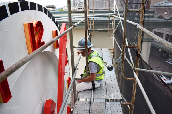 A three-person team will work to tackle this job, including setting up, prepping, cleaning, painting, and removing the scaffolding. NOVO will use a direct to metal enamel paint to restore our Clock & Sign so it can withstand the hot summer sun, rain and sometimes snow for many years to come!