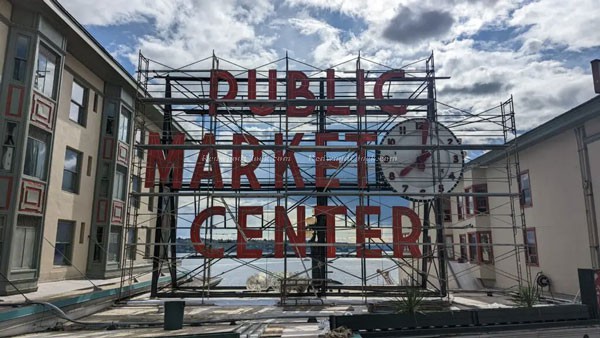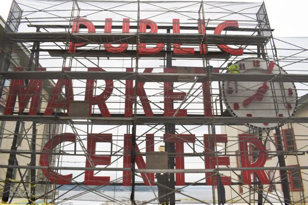 The sign at the corner of Pike Street and Pike Place (and the backdrop to billions of Market photos) will be covered for the next five weeks as local contractor NOVO makes our sign sparkle like never before.
